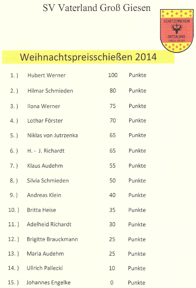 Ergebnisliste Weihnachtspreisschießen 2014 |