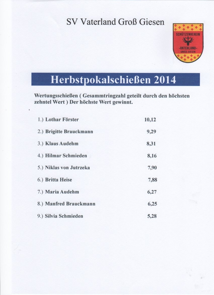 Endergebnis des Freundschaftsschießens Hasede, Sorsum, Giesen 2014 |